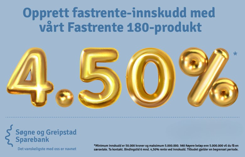 Nå er renten på fastrente-innskudd med vårt Fastrente 180-produkt på hele 4.50 %.