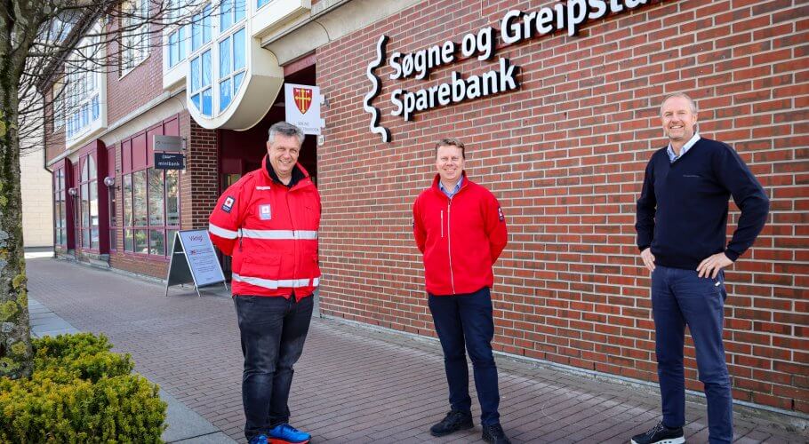Avbildet i saken er Tom Erik Dønnestad og Espen Aksnes fra Søgne Røde Kors Hjelpekorps sammen med banksjef Vidar Skaaland. På spørsmålet om hva støtten fra banken har betydd svarer Tom Erik Dønnestad: «Alt egentlig. Vi hadde ikke vært der vi er nå i dette prosjektet uten».